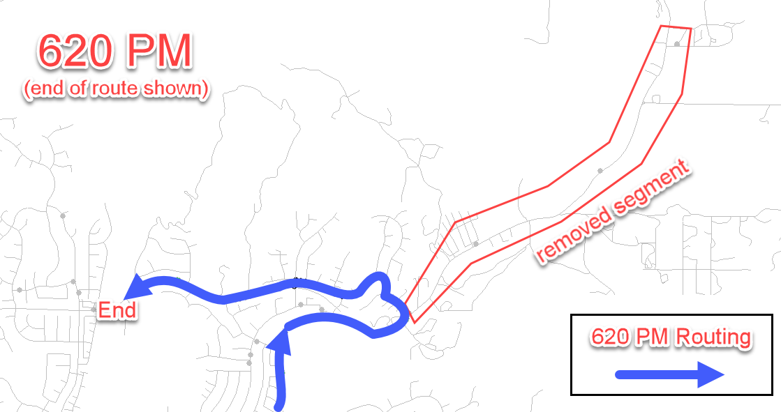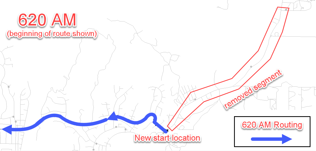 The area along Bouquet Canyon Rd, north of Shadow Valley Lane, will be removed from the Route 620 AM and PM service area. Please see the maps below highlighting the segment of the route that will be removed.